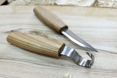 Then, the spoon carving set SK is ideal for cutting out your artwork. The set consists of a whittling knife and a hook knife. With the whittling knife, you give a shape to the spoon, then with the hook knife, you cut out the spoon and smooth it. That’s all, your spoon is ready!