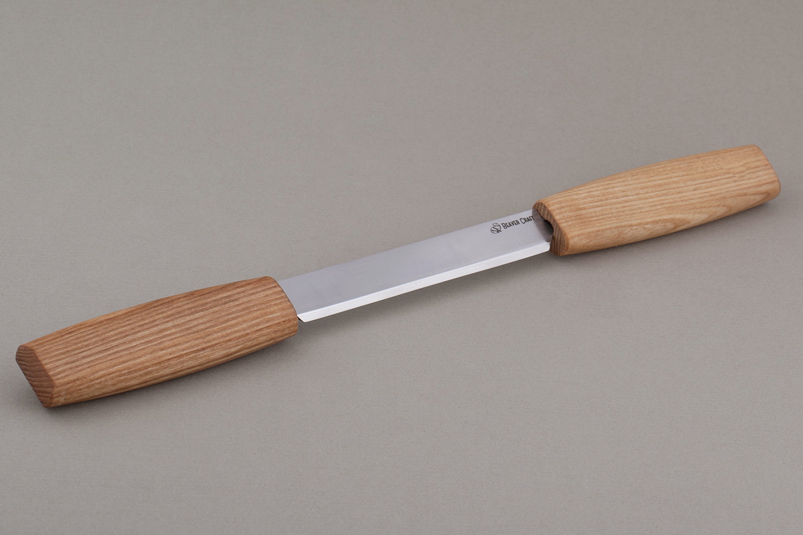 A drawknife (drawing knife, draw shave, shaving knife) is used to shape wood by removing shavings. This drawknife is a perfect tool if you want to remove not large slices of wood for flat faceted work. This shaving knife is designed for planning faceted parts or shaping a small circle. The blade has a thickness of only 2 mm, since this knife is designed for finishing delicate work.
